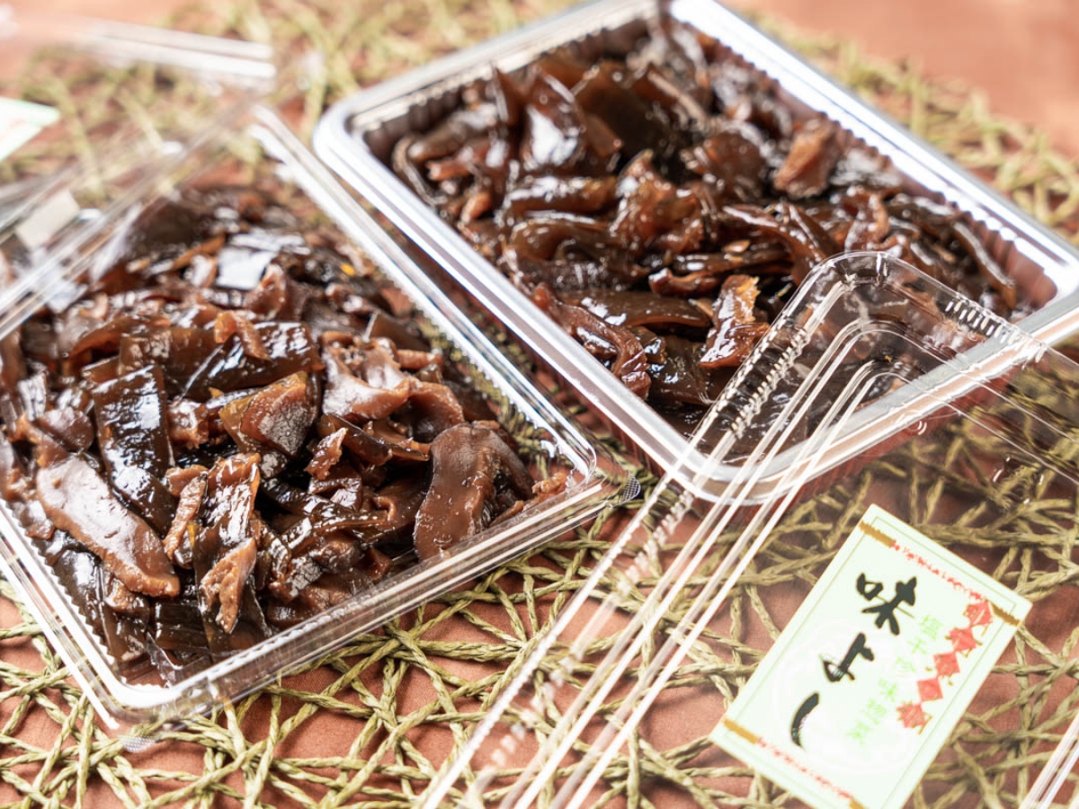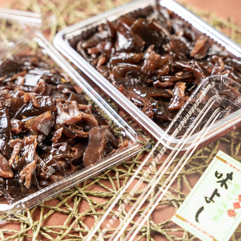 大阪・梅田の大手百貨店のデパ地下で毎週1回販売され、昼過ぎにはソールドアウトすることで知られる惣菜「味よし わかめ煮」。厚みがあってコリコリとした食感のわかめと椎茸をふっくら煮込んだ逸品は、明石の実店舗でも大人気です。